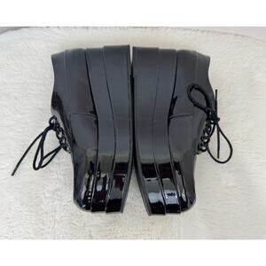 Shiny black patent, stacked platforms, and lace-up design give them a sleek 90s edge—perfect with jeans, skirts, or dresses.