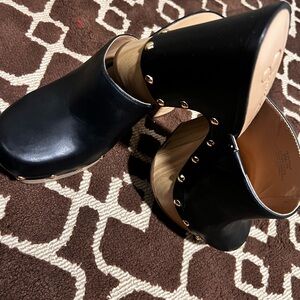 Elegant black mules with gold studs. Stylish tan wooden heel. Perfect for any occasion.