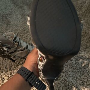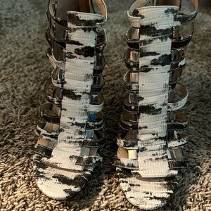 Elevate your style with these striking Jessica Simpson gladiator heels, featuring a bold black and white design. The intricate strappy construction wraps elegantly around the foot and ankle, adorned with silver-toned studs for a touch of edgy sophistication. With a high, slim heel, these shoes are perfect for making a statement at any fashionable event.