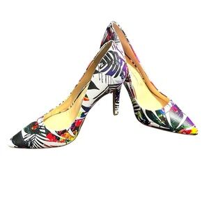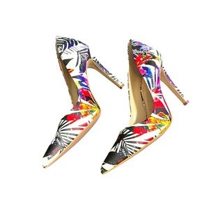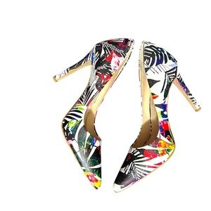 These elegant Jessica Simpson heels feature a sleek stiletto design in classic black and white. The pointed toe and smooth silhouette make them a sophisticated choice for any occasion.