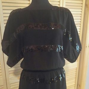 Worn once is Black with black sequins front and back. Super cute dress that shows off your legs!