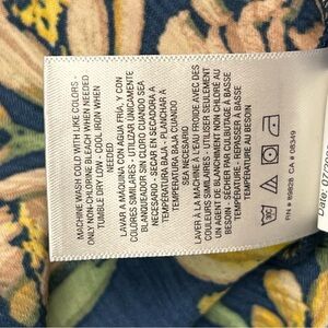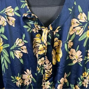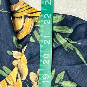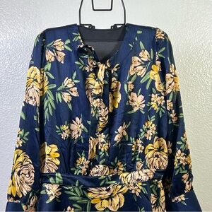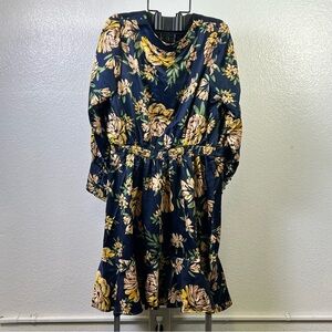 This beautiful dress features a vibrant floral pattern with large golden yellow flowers against a deep navy blue background. Designed with long sleeves and a flattering v-neckline, it is perfect for casual and work occasions.