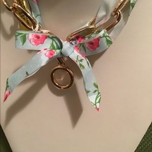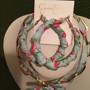 Jessica Simpson Blue & Pink Flower Ribbon Earrings with matching Blue & Pink Flower Ribbon and Gold Chain Necklace