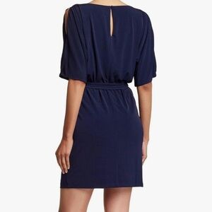 This stylish blue mini dress by Jessica Simpson features a chic cold shoulder neckline and short dolman sleeves, perfect for a cocktail night out. The sheath silhouette offers a modern and flattering fit, while the soft fabric ensures both comfort and style.