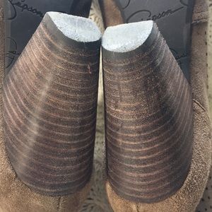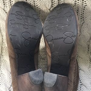 Suede Jessica Simpson booties with perforated upper. Some light wear on the toes and some small scuffs on the heels.