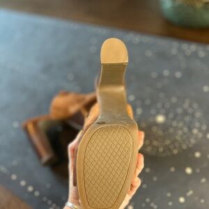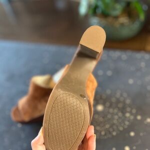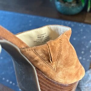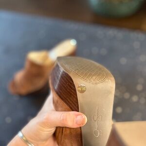 Jessica Simpson Heels brown suede upper with wooden platform. I have tried these on and worn to test them out. I can be a 8.5 or 9 and were just a tiny bit too lose to feel secure for me. Beautiful shoe and would look great with a maxi dress or flare pants for a 60s 70s vintage vibe.