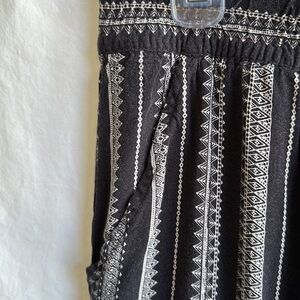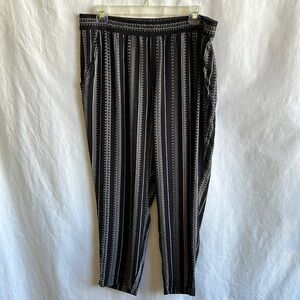 Jessica Simpson Cadie black and white print pants, size L. Good preowned condition. 100% viscose. Elastic waist, pull-on styling. Two front hip pockets.
