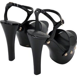 Turn heads with striking platform sandals showcasing a glossy patent finish and secure ankle strap. Versatile black pairs effortlessly with party looks. See photos for shine and stud accents.