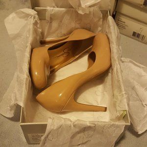 Jessica Simpson Calie Women's Size 7 Beige/Nude Shiny Patent Rounded-Toed Stiletto Pumps (4" High) in Used, Good Condition (with box)
