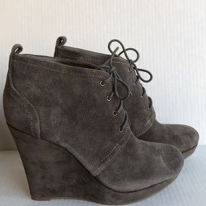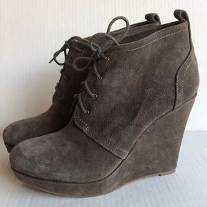 A cute suede boot features a narrow wedge and a chunky silhouette.