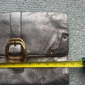 EUC Jessica Simpson Pewter And Gold hardware clutch purse inside zipper key clasp 2 pouches inside and 1 snap compartment on the outside back of purse