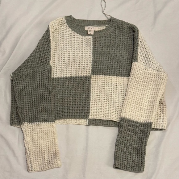 Stylish crew neck sweater by Jessica Simpson. Features a chic color block design of cream and grey-ish green colors. Perfect for casual wear.