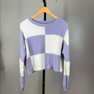 Stylish colorblock sweater. Features lavender and white stripes. Perfect for casual wear.