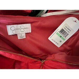 This is a Brand New with Tags Jessica Simpson Coral Fit & Flare Dress. It is a fabulous orange tone dress with a pleated skirt, a golden zipper down the front, and an open strappy style back.