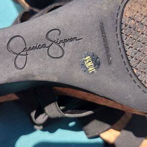 Jessica Simpson Cork Wedge Black Faux Leather Strappy Sandals, Back Zip, 9.5