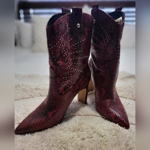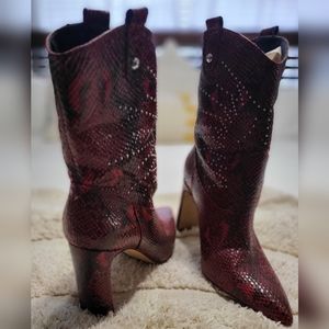 Jessica Simpson red and black alligator skin looking cowboy boots. In addition to the beautiful color of the boot it has detailed bedazzle. Only used once boots are in excellent condition.