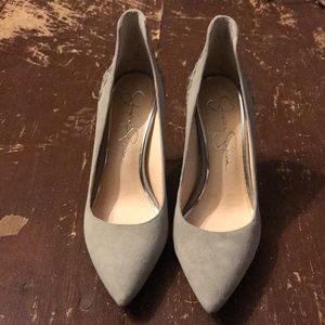 Warm stone (gray). Suede. Leather detailing on back of heels. Pointed toe. 4 inch heel. Worn once.