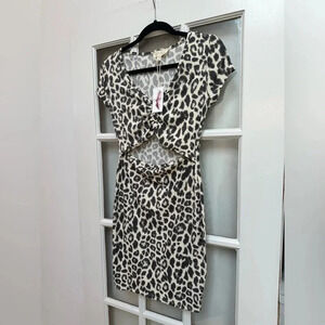 Jessica Simpson Cream Black Leopard Print Cut Out Short Sleeve Dress Size L NWT