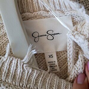Trendy Jessica Simpson cropped sweater in a cream/tan knit with distressed details at the hem, cuffs, and neckline. Soft, lightweight, and perfect for layering.
