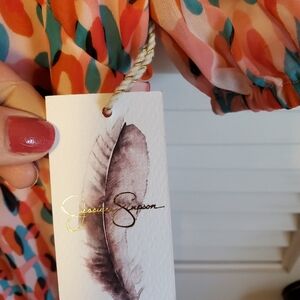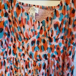 Has the brand tag but not the store tag. Pink, Orange, aqua and Black, With puff sleeves