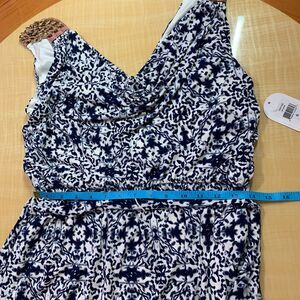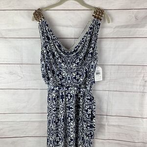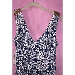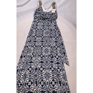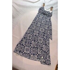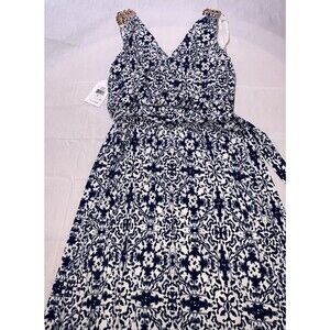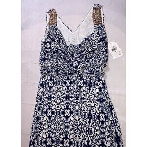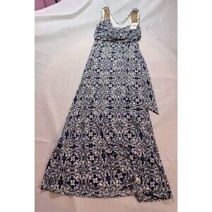 This stunning Jessica Simpson dress is perfect for any occasion. The blue geometric pattern and sleeveless design make it ideal for summer, while the long dress length and blouson style add a touch of elegance that is perfect for more formal events. The elastic waist is comfortable and flattering, and the pullover closure makes it easy to wear.