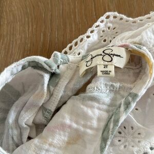 Beautiful Jessica Simpson dress with floral print and wooden button back. Eyelet sleeves.