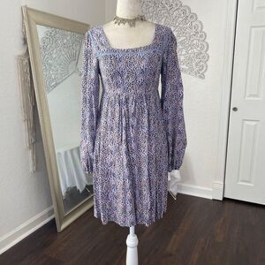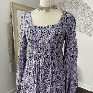 ༓ soft purple blue leopard cheetah print midi dress, babydoll cut, stretchy chest, long sleeves