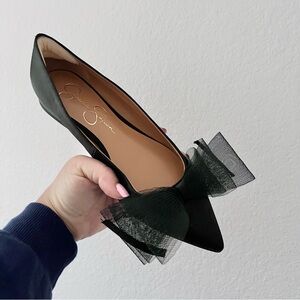 Jessica Simpson black satin pointed toe ballet flats with oversized mesh bow on toes. Worn once. Come in box. Perfect for the holiday season.