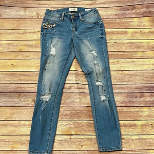 These are a light washed with fraying and distressed holes and embellishments of faux pearls and rhinestones