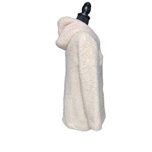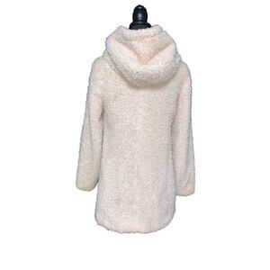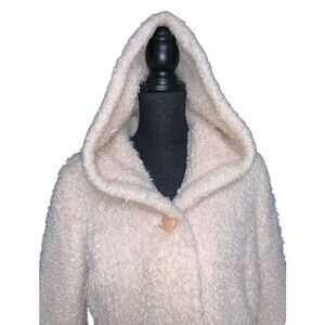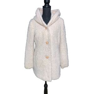 Beige hooded faux fur coat. Button front closure. Side pockets. Faux fur shell face/backing/lining: 100% polyester. Size: small. Preowned in good condition.