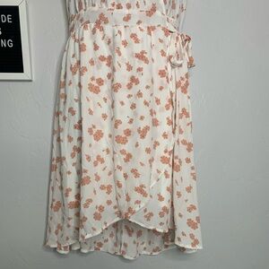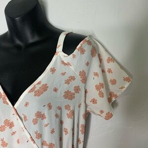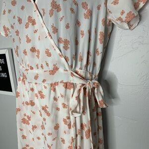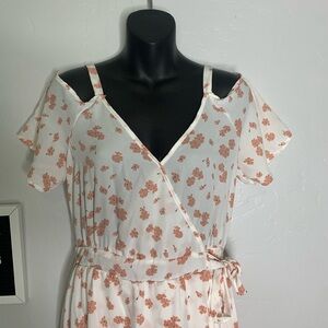 This is a lightweight white off the shoulder dress with a pink floral pattern. It has a faux wrap design in the front and is in a size large. It’s in perfect condition no stains or flaws.