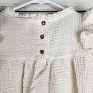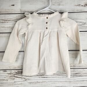 Pre-owned and Preloved adorable fall long sleeve toddler top. Condition is no stains, tears, or threading issues known. 3 wooden buttons on the back, ruffles on the shoulders, and gorgeous embroidery on the bottom.