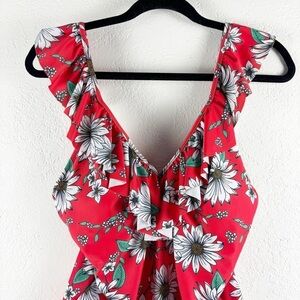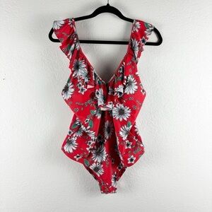 Jessica Simpson Floral Ruffle Frill One Piece Bathing Suit Swimsuit Red Large