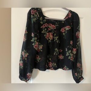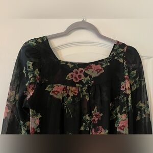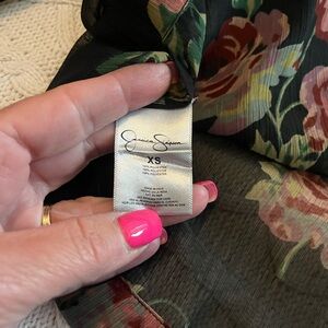 Sheer black blouse with vibrant floral pattern. Long sleeves and lightweight fabric. Wear with a camisole or tank underneath. EUC excellent condition & quality! Measurements in photos. Designer Jessica Simpson. Women’s size XS