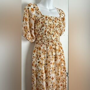 Embrace elegance with this floral smocked dress. Featuring a beautiful cream and orange pattern, it's perfect for any occasion.