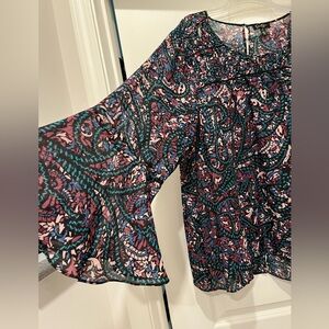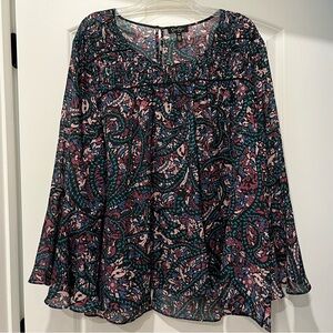 Jessica Simpson flowy funky top. Lightweight. Almost sheer but not able to see through. Smoke-free home. 2x but would also fit 3x. Like new. Worn maybe once. Slit in back of top - made like that.