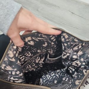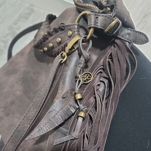 Stylish and versatile black leather shoulder bag with fringe detailing. Perfect for adding a touch of elegance to any outfit. Has some wear around the straps and zippers. Shoulder strap and long crossbody strap.