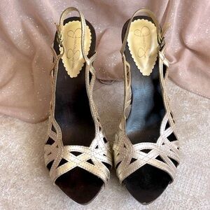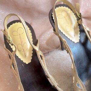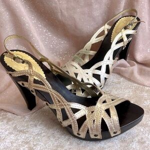 Jessica Simpson Genuine Leather Strappy Metallic Gold Die Cut Pumps Wooden Heels. Women's size 10. No box. Only worn twice. Pretty & sexy!