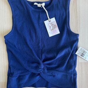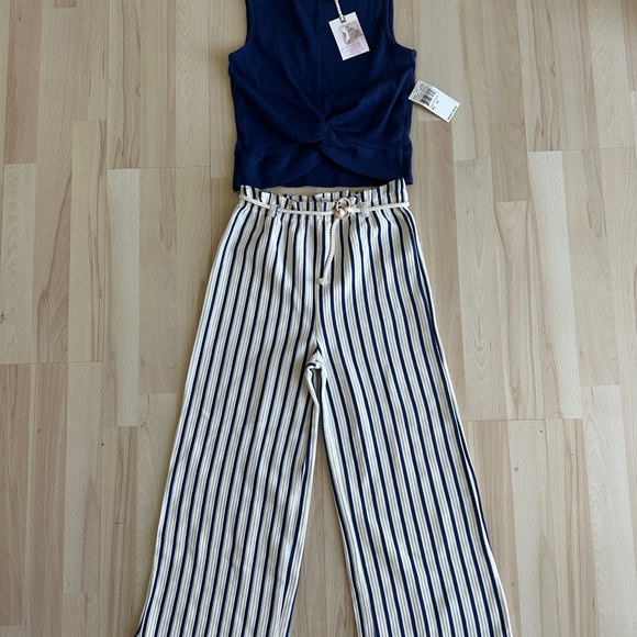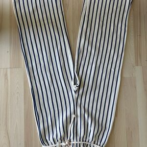Stylish wide leg jumpsuit with navy top and white striped pants. Features a twisted front design. Ideal for casual outings.