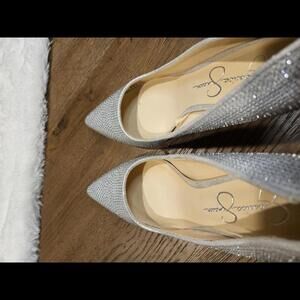 Step into elegance with these stunning Jessica Simpson high heels, perfect for any special occasion. Made of shimmering silver material adorned with sparkling details, these pointed-toe pumps redefine glamour. Features include: