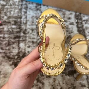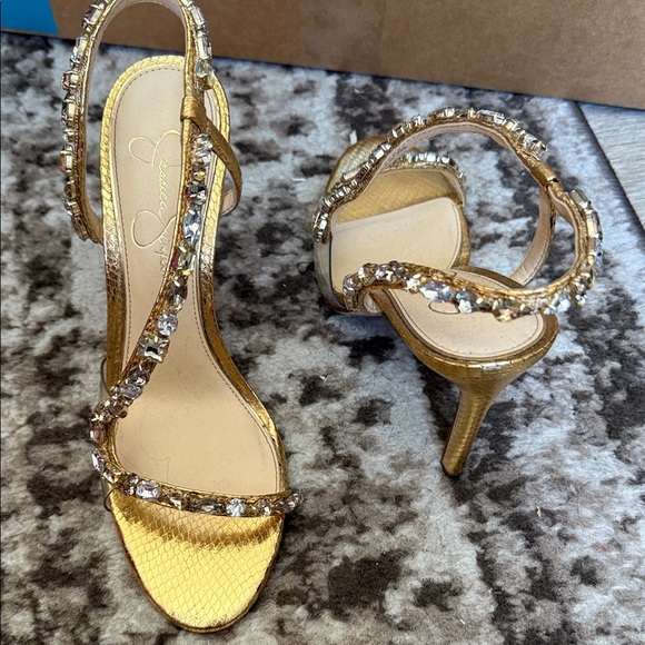 Brand new. Worn one time. Shimmering gold heels with rhinestone straps. Perfect for adding sparkle to any outfit.