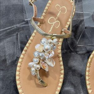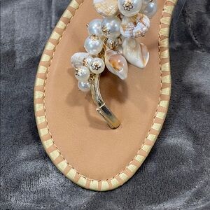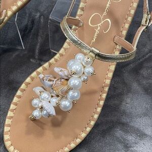 Chic gold sandals with stunning pearl accents. Perfect for a glamorous look.