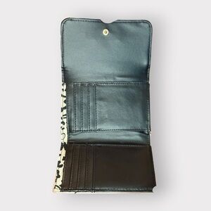 Stylish wallet with quilted texture. Features gold studs and logo. Compact and elegant design.