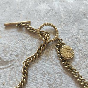 This Jessica Simpson Gold tone/rhinestone Necklace w/ matching Bracelet set is unique. Bothe the necklace and bracelet have a toggle closure.