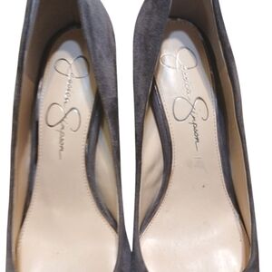 These Jessica Simpson heels feature a sophisticated dark gray hue with a luxurious suede finish, offering a versatile and elegant look. The classic pump design includes a rounded toe and a stable block heel, providing both style and comfort for any occasion.