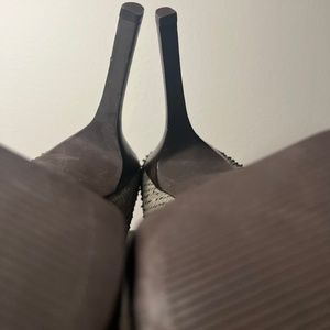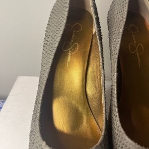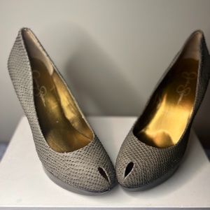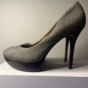Super cute peep toe w/ Snakeskin embossed with the edges of the scales lifted slightly. Smooth bronzy manmade lining.