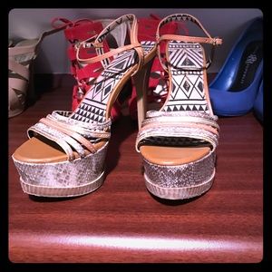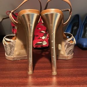 These are high heeled sandals. They are tan with gold. There are a few blemishes that you can see in the images.