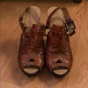 Brown leather platform heels, open back with heel strap, brass metal details.