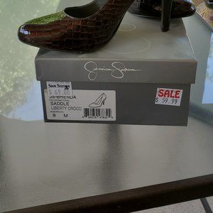 Jessica Simpson Brenda High Heel shoe.  Saddle color (dark brown). It has a shiny crocodile pattern. Brand new, never worn in box.