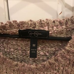 Neutral textured Jessica Simpson sweater hangs low in the front and rises high in the back neutral tan and brown tones are mixed in with shimmery gold accent details that really add to the piece, gently worn LIKE NEW!!